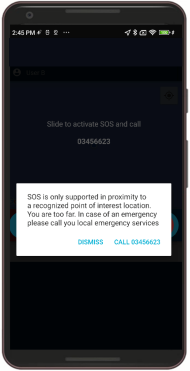 Organizations focused on facility based activities can now set the range for SOS activation based on mobile user's proximity to a predefined POIs, in line with their incident management SLA protocols. Setting the configuration, New incident location uses POI, for your organization has the additional functionality of blocking SOS when mobile users are farther than the defined distance from POIs. Once the user moves closer to the POI this functionality is restored. When the SOS is blocked, a popup prompts the user to call the local authorities.