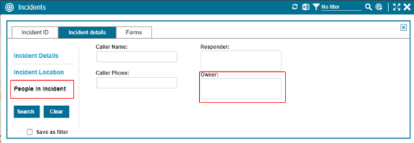 You can now easily search or filter Incidents by the user who opened an Incident, called the incident owner. The incident owner can be a mobile responder, dispatcher, or administrator user. When searching or filtering in Incidents, select the People in Incident tab and type the name that you want to search in the Owner box.