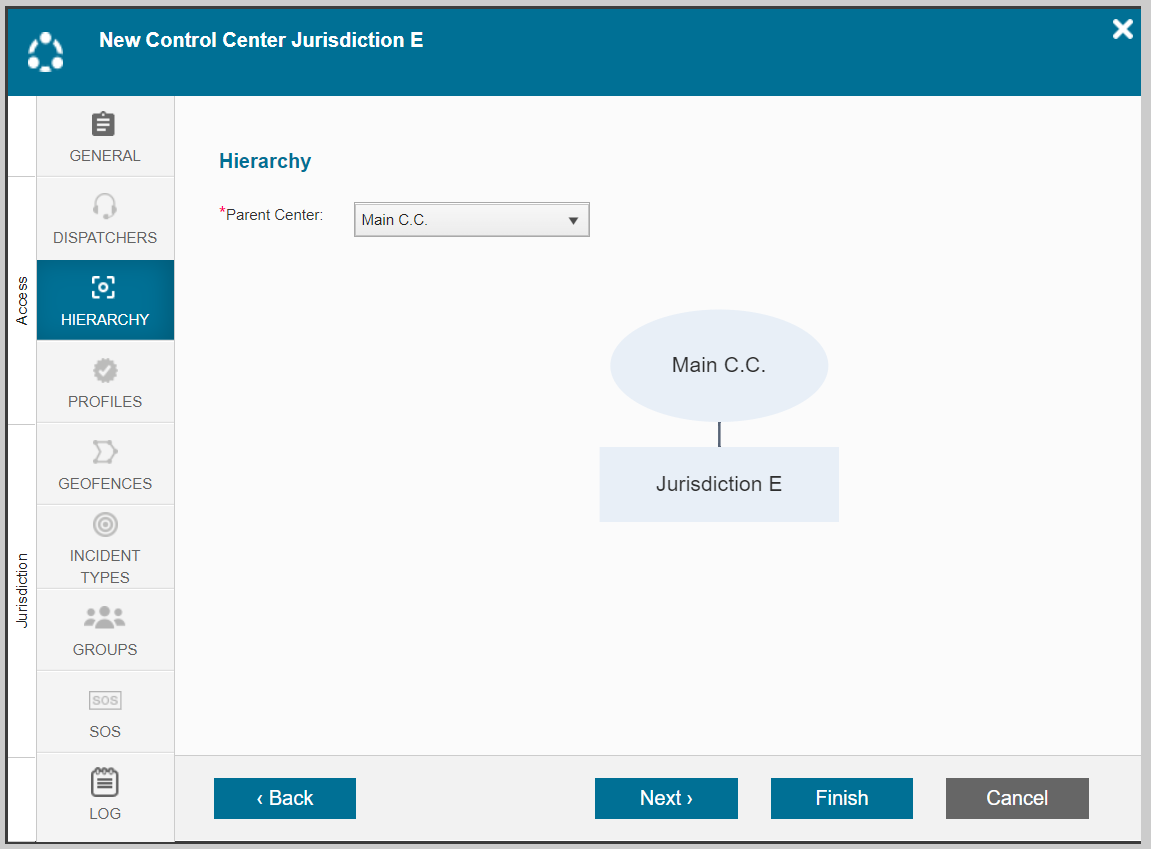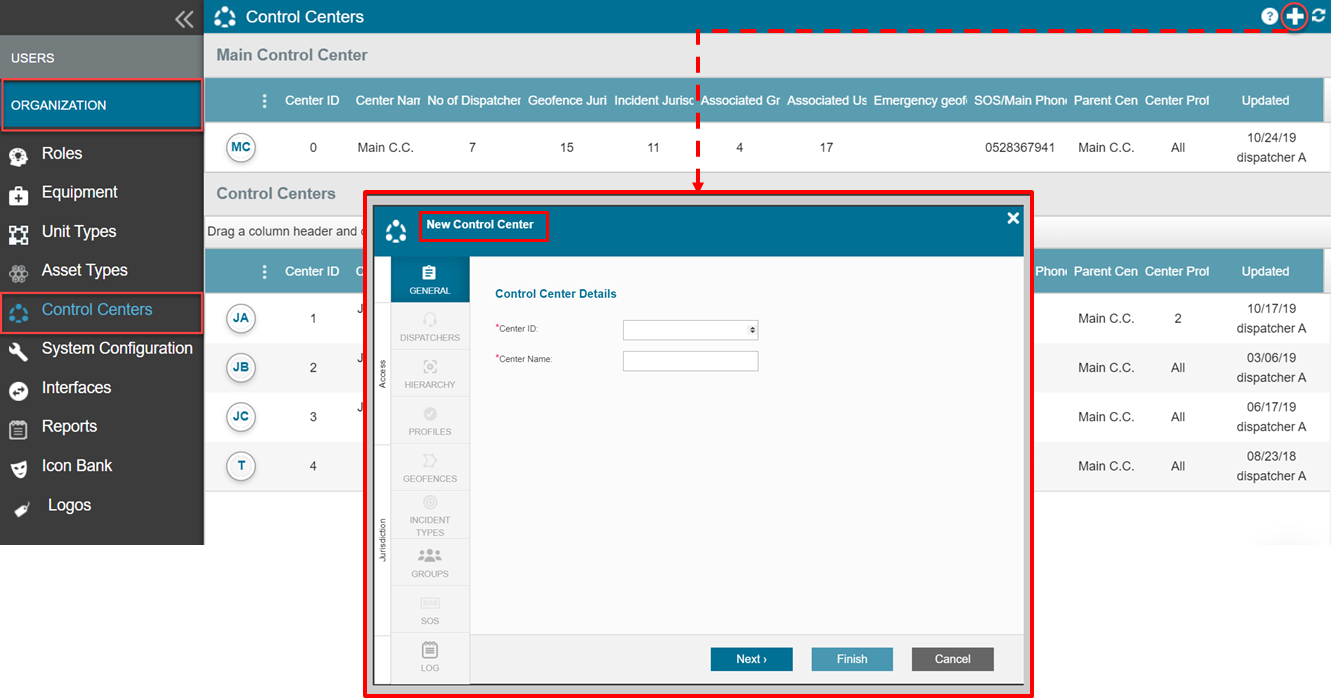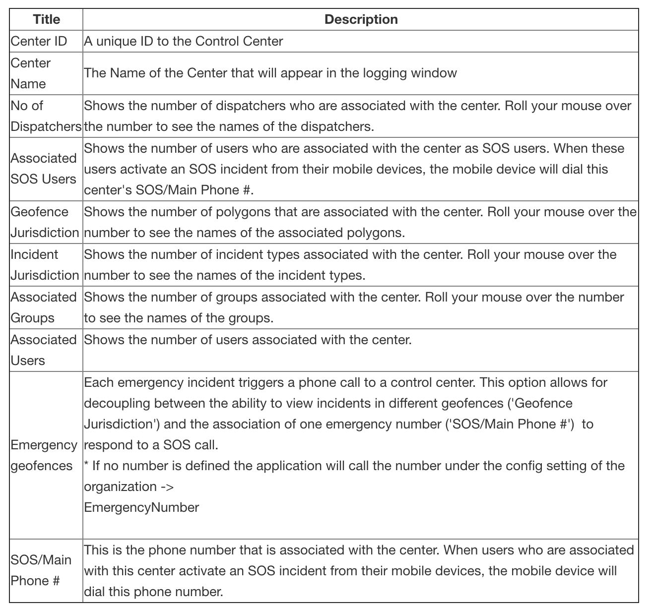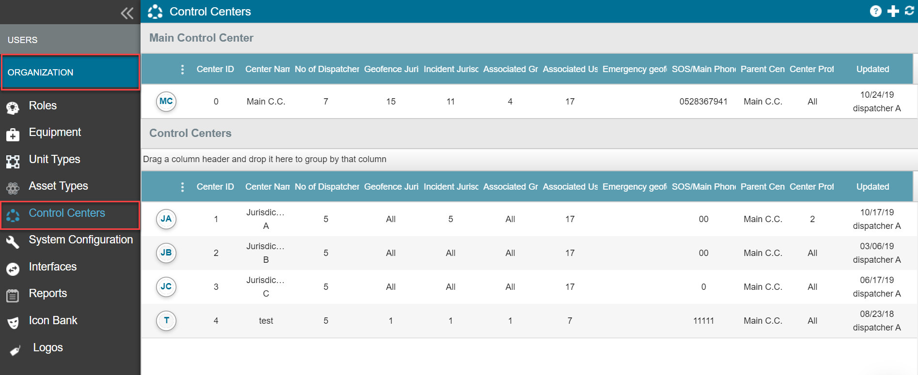 The Main Control Center has by definition, unlimited jurisdiction over all entities (users, groups, geofences/polygons, incident types etc.) in your organization. The Main CC's jurisdiction cannot be restricted. Therefore, editing actions within this section are limited to: changing the name of the center and SOS/Main Phone Number, and adding dispatchers.