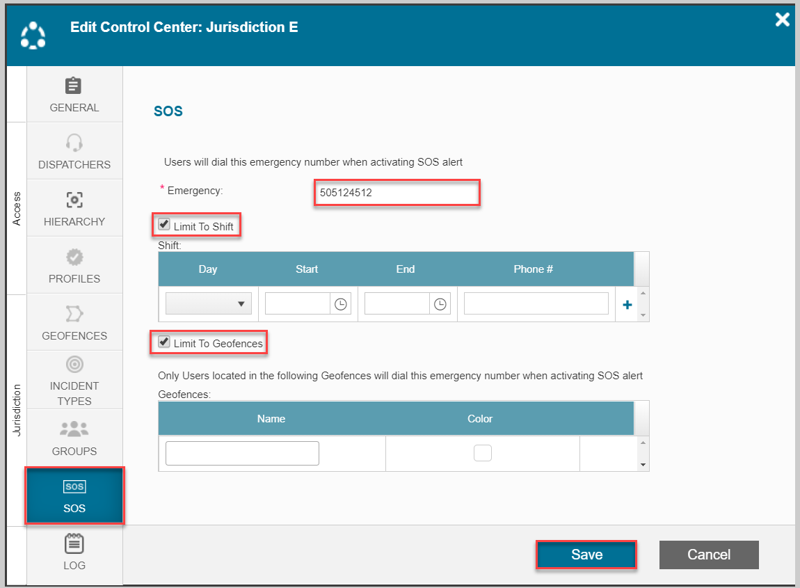 - In the SOS tab type in the emergency number in the field. This is the phone number that will be dialed by the app when activating an SOS alert. You may also select Limit to Shift or Limit to Geofence for that emergency number. Additional dropdown fields appear for you to provide preferred Shift settings and Geofence settings.