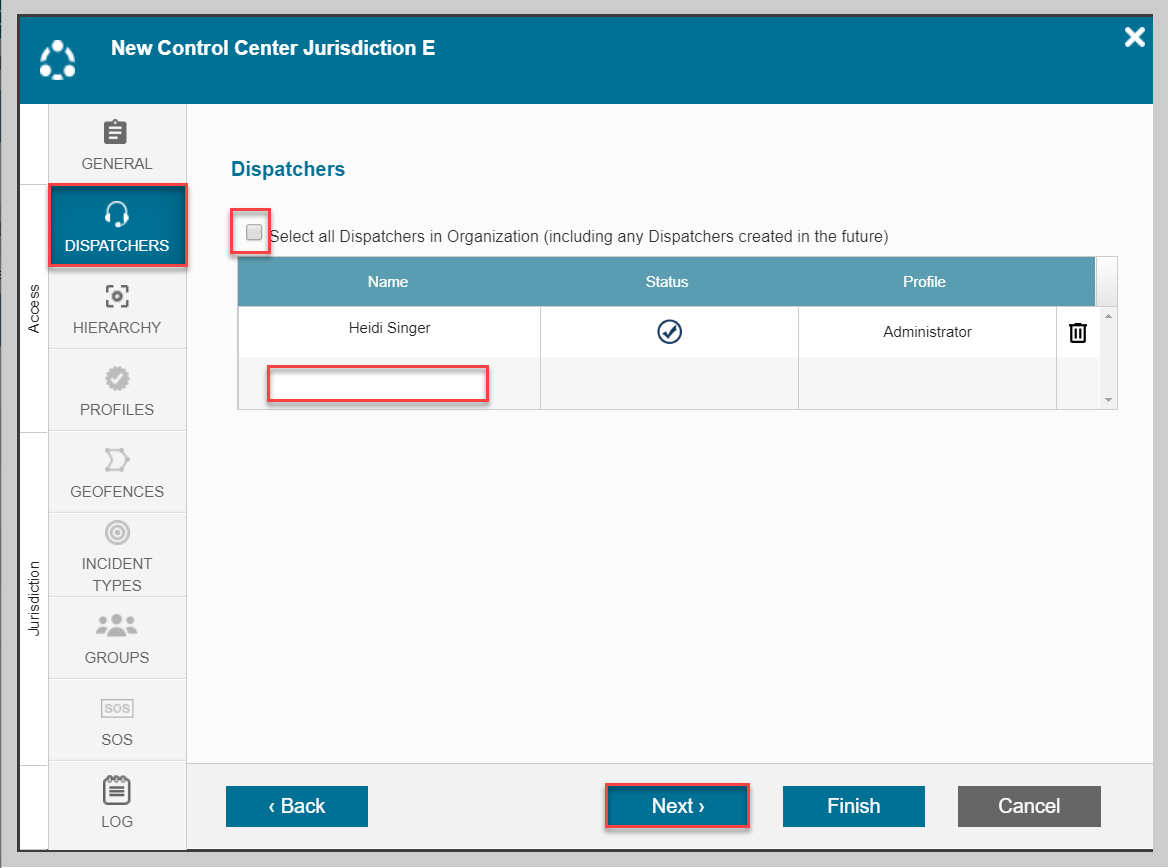 - In Dispatchers tab either select All Dispatchers in Organization (including any Dispatchers created in the future) or enter the specific dispatcher into Name field.