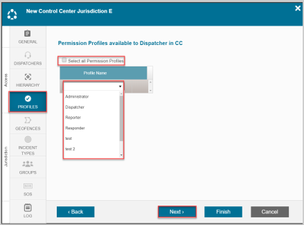 - In Profiles tab either select All Permission Profiles or specific Profiles from the dropdown list. This list will define which profiles will be available to the CC operator/dispatcher when creating/editing user profiles