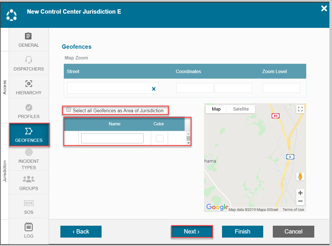 - In the Geofence tab either select Select all Geofences as Area of Jurisdiction or using the dropdown, select the relevant geofences.