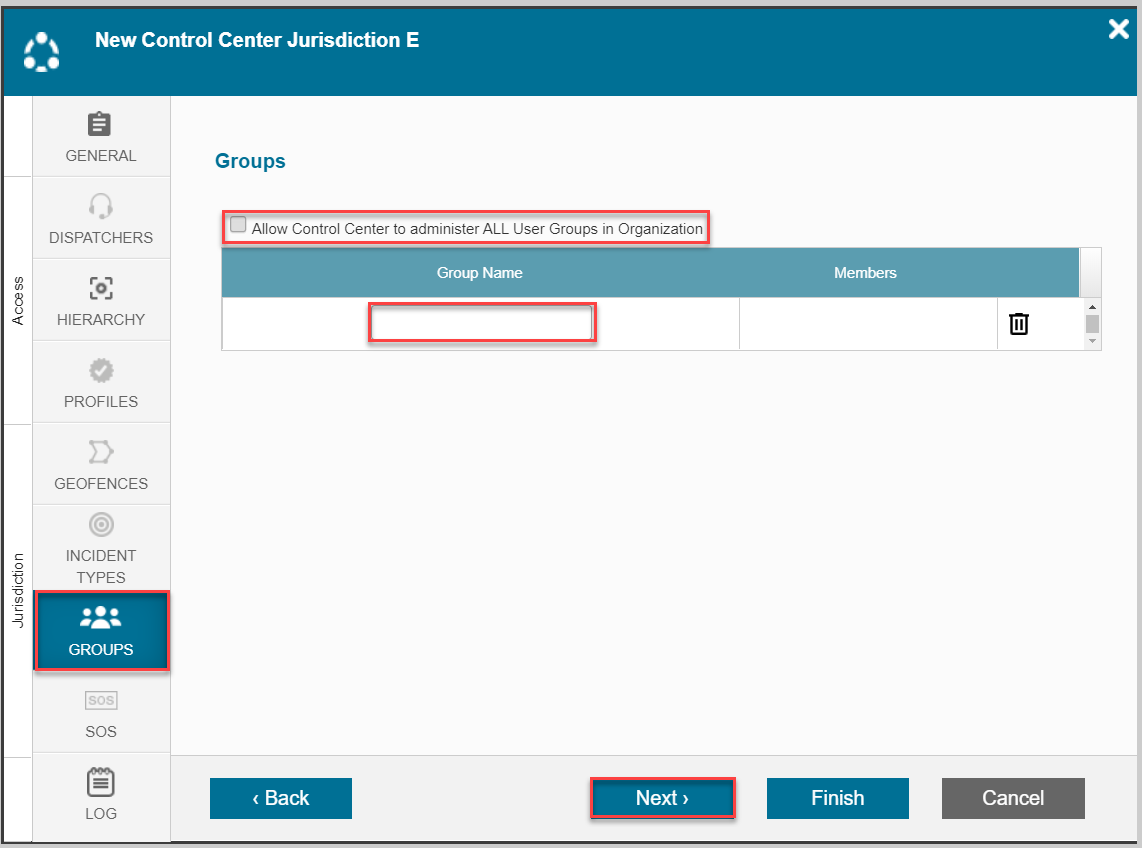 - In the Groups tab, either select Allow Control Center to administer ALL User Groups in Organization (including any Group created in the future) or enter the relevant Group Names in the text box.