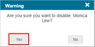 - Click Yes to confirm that you want to disable the user.